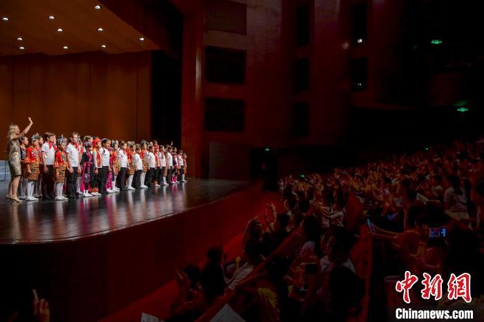 10月25日晚,來自法國的巴黎寶麗聲童聲合唱團和海南五指山黎苗童聲合唱團,在海南省歌舞劇院聯(lián)袂合唱經(jīng)典歌曲《友誼天長地久》。中新社記者 駱云飛 攝