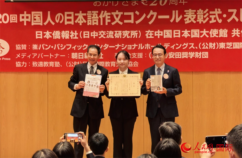 人民網(wǎng)北京11月16日電 (記者陳建軍)11月15日下午,由日本僑報(bào)社主辦的第20屆中國(guó)人日語(yǔ)作文大賽頒獎(jiǎng)典禮暨日語(yǔ)演講大會(huì)在北京舉行。大連外國(guó)語(yǔ)大學(xué)三年級(jí)學(xué)生林芳菲憑借《“完美”朋友——小夢(mèng)教給我的事情》一文獲得最優(yōu)秀獎(jiǎng)“日本大使獎(jiǎng)”,日本駐華大使金杉憲治為其頒獎(jiǎng)。