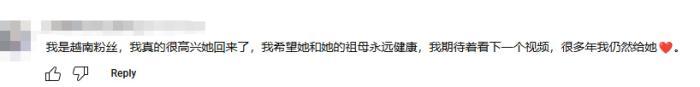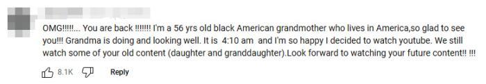 一位美國網(wǎng)友寫道:“天?。。?!你回來了?。?!我是一名生活在美國的56歲黑人奶奶??吹侥?的視頻)真是太好了。(你的)奶奶看上去狀態(tài)也很好?,F(xiàn)在是凌晨4點10分,我對自己點開YouTube的決定無比開心。我們(女兒和外孫女)還在看你以前的視頻。期待看到你未來的作品。”