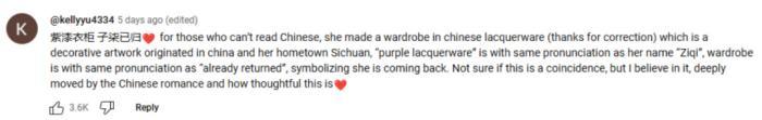 還有網(wǎng)友分析這期以“衣柜”為主題的視頻,贊嘆“中國式浪漫”:“她將一件舊衣柜翻新為漆器,這是一種源自中國和她的家鄉(xiāng)四川的裝飾藝術(shù)品?!仙崞鳌c她的名字‘子柒’發(fā)音相同,‘衣柜’與‘已經(jīng)歸來’相同,象征著李子柒已經(jīng)歸來。不確定這是不是巧合,但我愿意相信,我被這中國式浪漫深深打動了。”