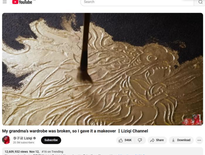 李子柒的最新視頻之一《My grandma’s wardrobe was broken, so I gave it a makeover》(中文視頻《雕漆隱花,雕出紫氣東來!》)上線不到一周,在海外視頻平臺YouTube就已收獲超1260萬瀏覽量。