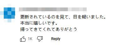 有日語留言:“看到更新時我簡直不敢相信自己的眼睛。真的很高興。謝謝你回來?!?/p>