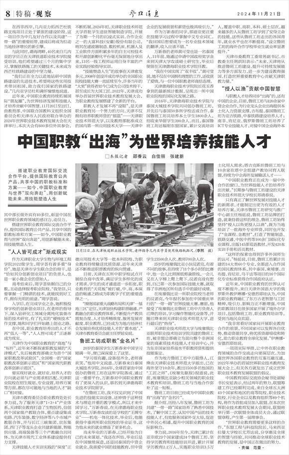 近年來,中國職業(yè)教育持續(xù)拓展國際“朋友圈”,為世界經(jīng)濟發(fā)展和技能人才培養(yǎng)貢獻中國智慧。11月20日至22日,由教育部、中國聯(lián)合國教科文組織全國委員會和天津市人民政府聯(lián)合舉辦的2024年世界職業(yè)技術教育發(fā)展大會在天津舉行。本次大會有600多位外賓參會,其中部長級外賓有40多位,彰顯中國在世界職業(yè)教育領域的感召力、動員力。