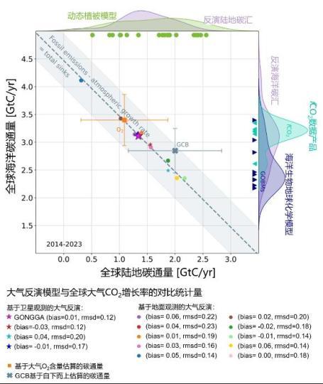 全球陸地與海洋碳匯估算及各大氣反演模型與全球多年大氣二氧化碳增長率的對比統(tǒng)計(jì)量示意圖。中國科學(xué)院青藏高原研究所 供圖