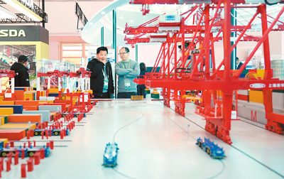 11月27日,在第二屆鏈博會先進(jìn)制造鏈展區(qū),人們在中交集團(tuán)展臺參觀上海洋山四期自動化碼頭模型。