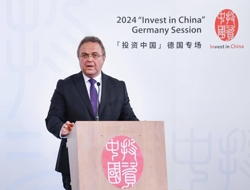 4月5日,德國聯(lián)邦議院德中議會小組主席弗里德里希在德國斯圖加特舉行的2024“投資中國”系列活動德國專場上致辭。新華社記者任鵬飛攝