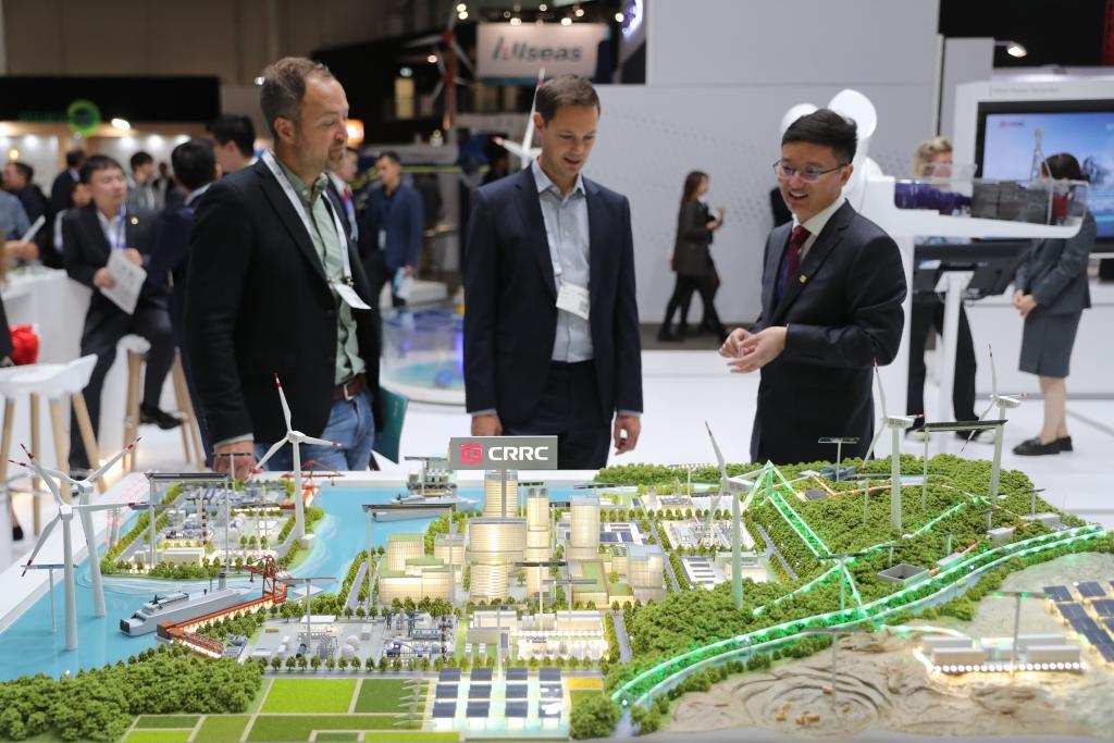 9月24日,在德國漢堡國際風能展中國中車展區(qū),工作人員為參觀者講解沙盤模型。新華社記者杜哲宇攝