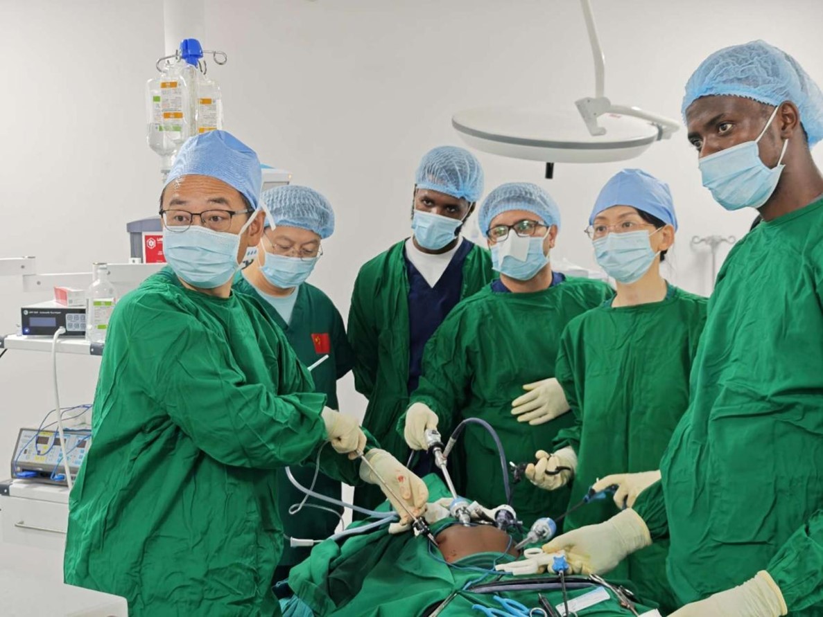中外醫(yī)師合作進(jìn)行腹腔鏡手術(shù)。中國援桑醫(yī)療隊(duì)供圖