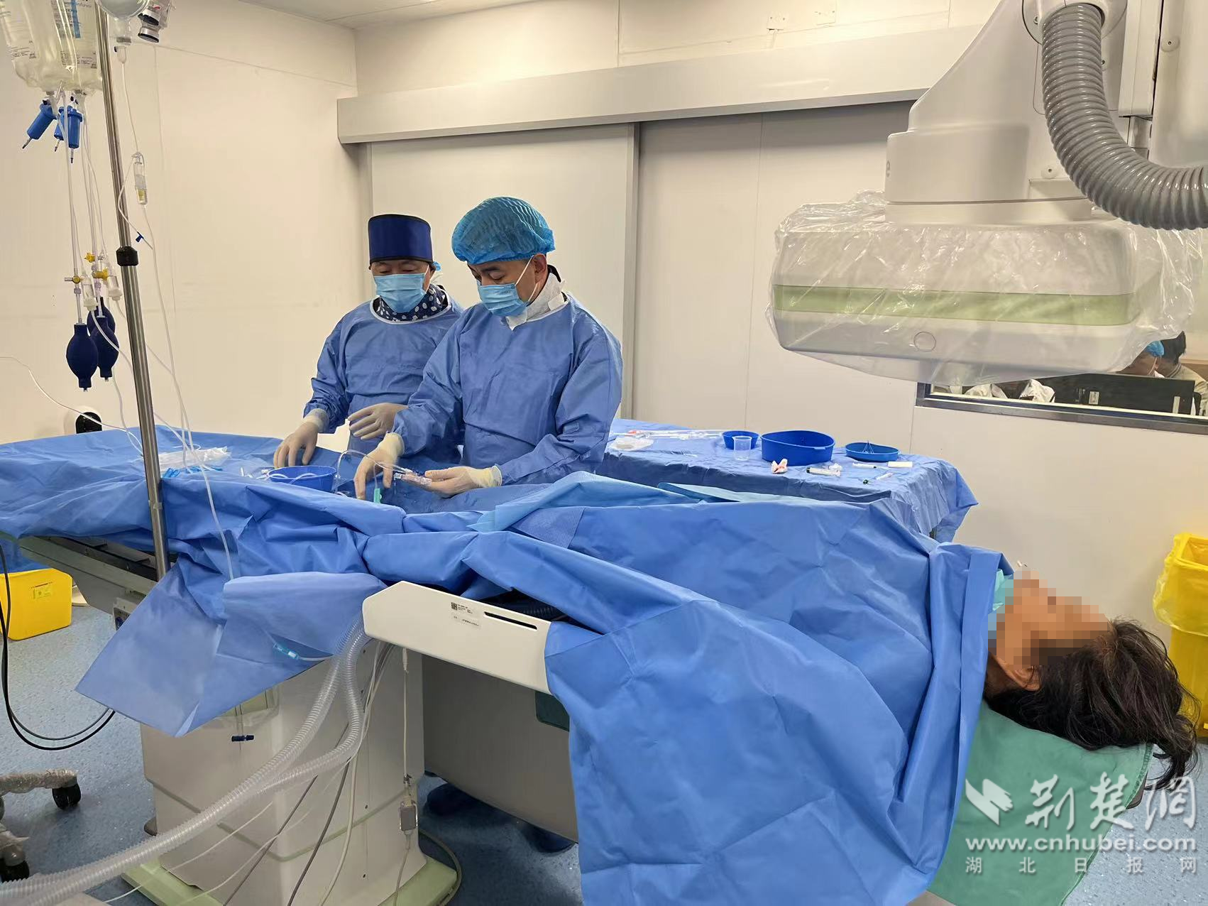 12月11日,66歲的徐女士在家中突發(fā)頭痛、頭昏、乏力,右側(cè)肢體無(wú)力,并伴有多次惡心嘔吐,暈倒在地后,被家人撥打120緊急送入孝感市中醫(yī)醫(yī)院。檢查顯示蛛網(wǎng)膜下腔出血,急診以大腦中動(dòng)脈瘤破裂伴蛛網(wǎng)膜下腔出血收入外一科住院。患者隨時(shí)可能病情惡化,導(dǎo)致腦疝、遲發(fā)性腦出血、癲癇、急性心肌梗死、肺栓塞、應(yīng)激性潰瘍急性腦梗塞、惡性心律失常、多器官功能不全甚至心臟驟停等危險(xiǎn)。ICU主任沈傳運(yùn)和神經(jīng)外科主任顏學(xué)槐會(huì)診后,徐女士被轉(zhuǎn)入ICU進(jìn)行重癥監(jiān)護(hù)支持治療。與此同時(shí),孝感市中醫(yī)醫(yī)院通過(guò)醫(yī)聯(lián)體,邀請(qǐng)武漢市第一醫(yī)院羅明教授星夜馳援。