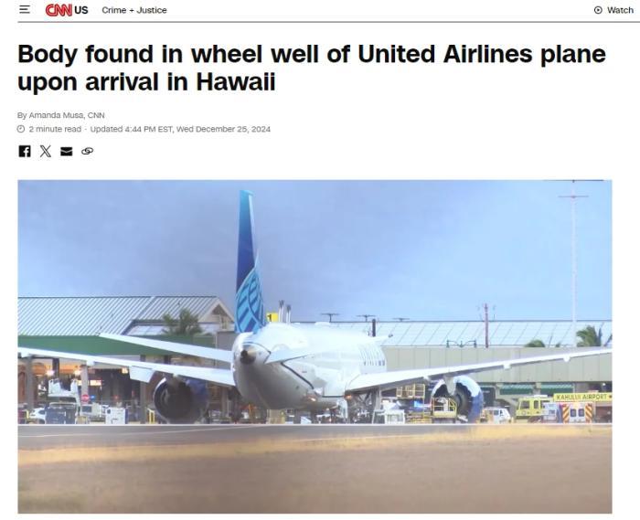 中新網(wǎng)12月26日電 據(jù)美國有線電視新聞網(wǎng)(CNN)報(bào)道,當(dāng)?shù)貢r(shí)間12月25日,美國聯(lián)合航空公司發(fā)布聲明稱,24日從芝加哥出發(fā)的美聯(lián)航202航班抵達(dá)夏威夷的毛伊島后,在飛機(jī)主起落架的輪艙內(nèi)發(fā)現(xiàn)一具尸體。