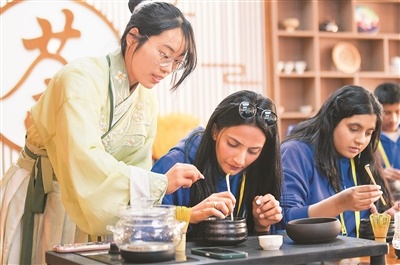 2024年4月15日,2024年“漢語(yǔ)橋”上海合作組織國(guó)家青年學(xué)生春令營(yíng)開營(yíng)儀式在新疆師范大學(xué)舉行。來(lái)自8個(gè)上合組織國(guó)家的近500名青年學(xué)生參加了此次春令營(yíng)。圖為參加春令營(yíng)的來(lái)華青年學(xué)生在新疆師范大學(xué)學(xué)生(左)的指導(dǎo)下學(xué)習(xí)茶藝。