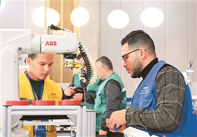 2024年12月18日,第三屆上合組織國(guó)家職工技能大賽在青島市開幕。圖為來(lái)自埃及的易卜拉欣·穆西·赫爾米·穆西(前右)與穆斯塔法·霍斯尼·穆斯塔法·梅特瓦利(前左)在工業(yè)機(jī)器人操作調(diào)整工項(xiàng)目比賽中。