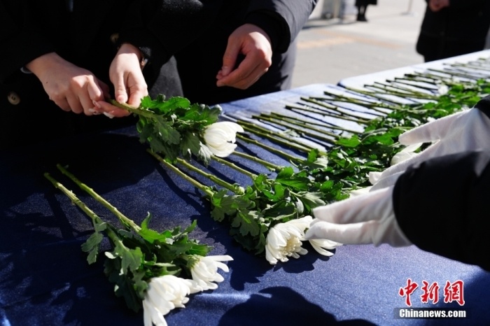 當?shù)貢r間2024年12月31日,韓國民眾在首爾市設(shè)立的靈堂領(lǐng)取鮮花,哀悼失事客機遇難者。中新社記者 劉旭 攝