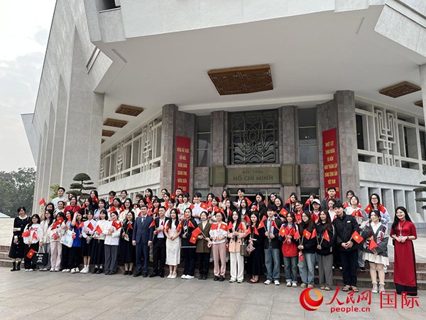 中越兩國(guó)青年學(xué)子在胡志明博物館前合影留念。人民網(wǎng)記者 楊曄攝