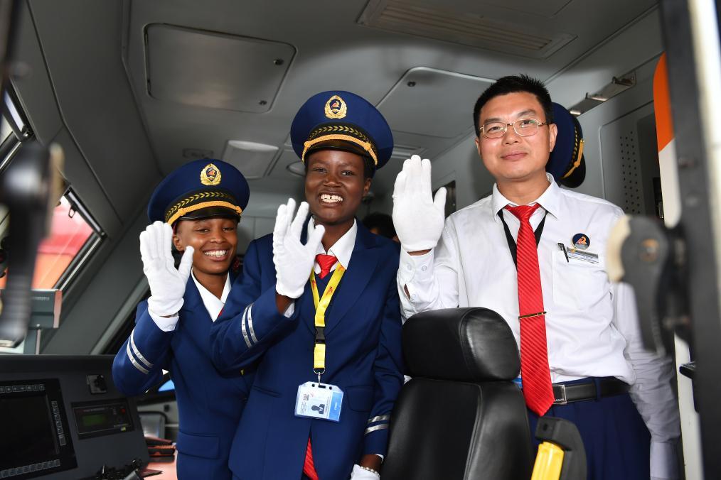 2017年5月31日,在肯尼亞蒙內鐵路蒙巴薩西站,火車司機艾麗斯(左)、肯西莉亞(中)和旅客列車指導司機涂主新在蒙內鐵路首班列車發(fā)車前揮手致意。(新華社記者孫瑞博攝)