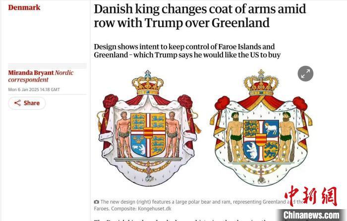 英國(guó)《每日郵報(bào)》等多家媒體報(bào)道稱,此舉被視為對(duì)美國(guó)當(dāng)選總統(tǒng)特朗普“購(gòu)島”言論的回應(yīng)與警告。報(bào)道稱,一只更大、更具攻擊性的北極熊現(xiàn)在占據(jù)徽章的醒目位置,其兇猛的紅色舌頭強(qiáng)調(diào)了丹麥對(duì)格陵蘭島的堅(jiān)定主權(quán)。北極熊身旁則是肌肉發(fā)達(dá)的北歐人,他們手持棍棒,展示著力量。