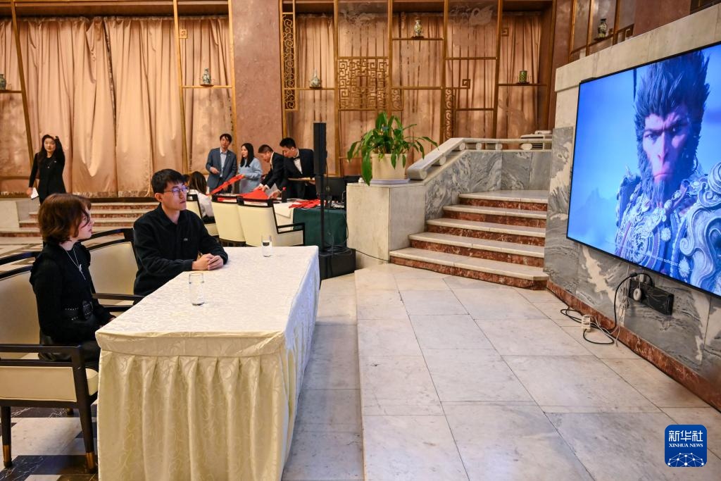 1月6日,在俄羅斯首都莫斯科,安娜(左前)在中國(guó)駐俄羅斯大使館內(nèi)體驗(yàn)《黑神話:悟空》游戲。新華社記者 曹陽(yáng) 攝