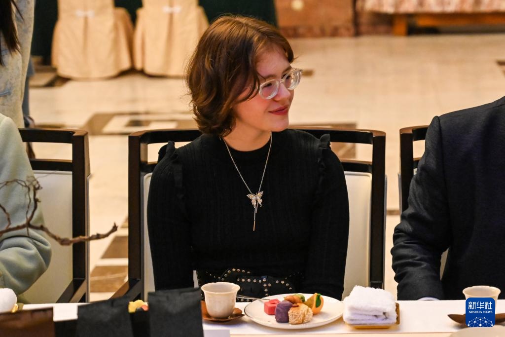 1月6日,在俄羅斯首都莫斯科,安娜在中國(guó)駐俄羅斯大使館內(nèi)了解茶文化。新華社記者 曹陽(yáng) 攝