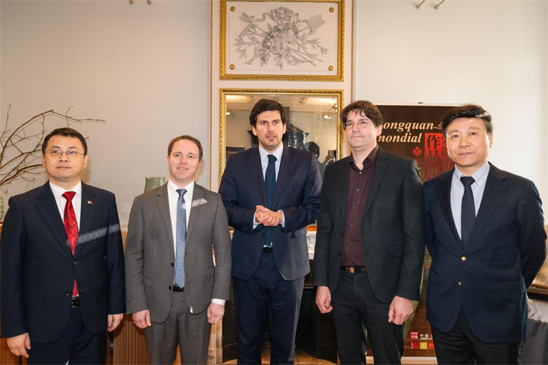 嘉賓出席“天下龍泉·宋韻青瓷作品展”開(kāi)幕式(從左至右依次為中國(guó)駐斯特拉斯堡總領(lǐng)事潘昱旻、勒米爾蒙市市長(zhǎng)蒂塞朗、參議員昂格雷、查爾·弗里里博物館館長(zhǎng)瓦謝雷、巴黎中國(guó)文化中心主任劉紅革)。主辦方供圖