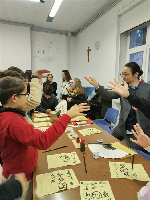 孔院開放日活動現(xiàn)場,學(xué)生參加中國傳統(tǒng)文化項目。圣馬力諾大學(xué)孔子學(xué)院供圖