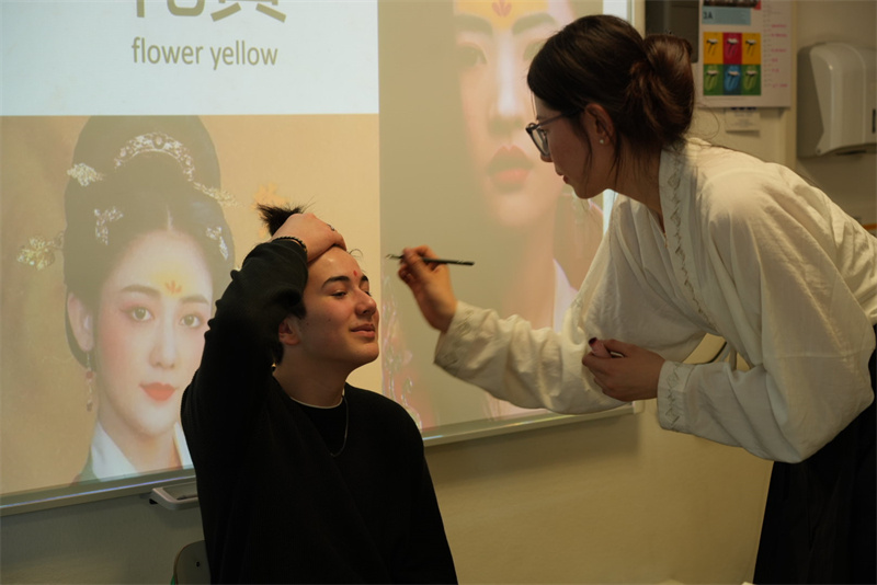 開放日活動古今呼應(yīng),為師生提供了了解中國體育項目、傳統(tǒng)服飾、中國書法、民樂民族舞以及中國美食茶飲的機(jī)會。師生紛紛嘗試傳統(tǒng)禮儀和宴飲游戲投壺,對非物質(zhì)文化遺產(chǎn)簪花項目興趣盎然。中國書法吸引了大批興奮的觀眾和體驗者,師生紛紛用毛筆寫下自己的中文名字。來賓們在茶香中聆聽了悠遠(yuǎn)的二胡演奏,觀賞了民族舞《白蛇·緣起》,中國美食的香氣吸引了在校的其他老師前來品鑒。