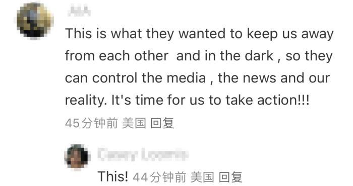 還有美國(guó)網(wǎng)友憤怒評(píng)價(jià)道,“(美國(guó))政客們表現(xiàn)得好像我們的聲音很重要,但他們沒有這樣做!都毫不在乎!”“這就是他們想要的,讓我們遠(yuǎn)離彼此,處于黑暗之中,這樣他們就可以控制媒體和我們的現(xiàn)實(shí)生活。是時(shí)候采取行動(dòng)了!”