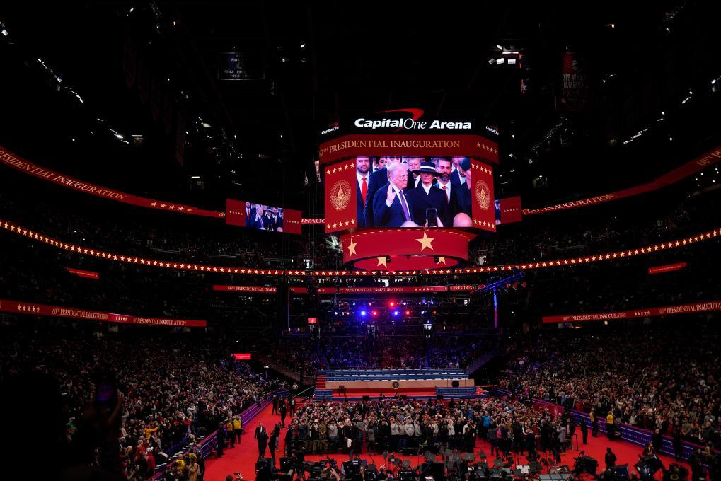 1月20日,在美國首都華盛頓第一資本體育館,人們觀看美國第47任總統(tǒng)就職典禮的轉(zhuǎn)播。新華社記者 吳曉凌 攝