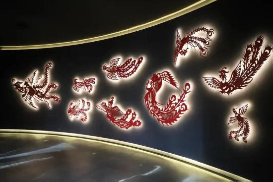 “這是我們當(dāng)時制作的百鳳圖,參加了中國首屆藝術(shù)節(jié),并獲得了優(yōu)秀作品獎。”管麗芳介紹道。1988年胡均啟曾攜整套初版百鳳圖參加中國首屆藝術(shù)節(jié),其造型獨特,展現(xiàn)出民間鳳凰形象的多樣性和藝術(shù)性,管麗芳在此基礎(chǔ)上對部分鳳凰圖案加以修改,新《百鳳圖》更具設(shè)計感,一百只鳳凰姿態(tài)各異,或高翔、或俯沖、或鳴叫、或棲息,呈現(xiàn)出百鳳爭鳴的吉兆祥瑞。