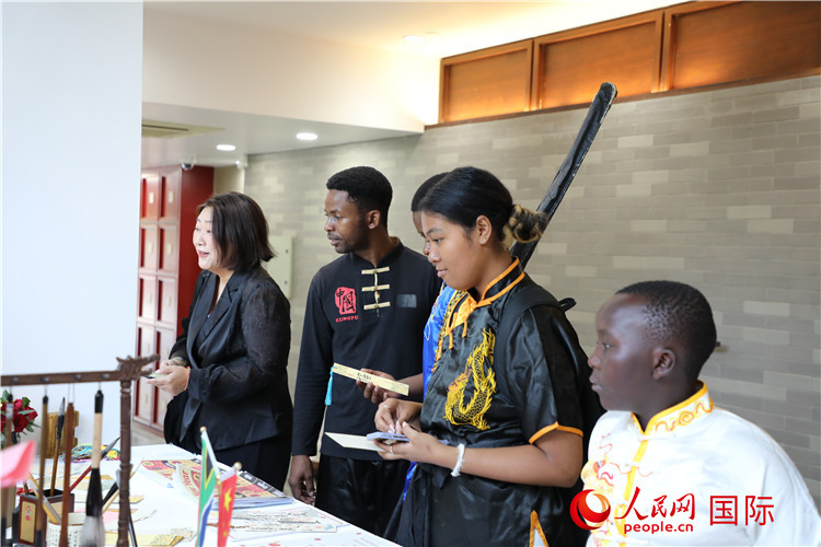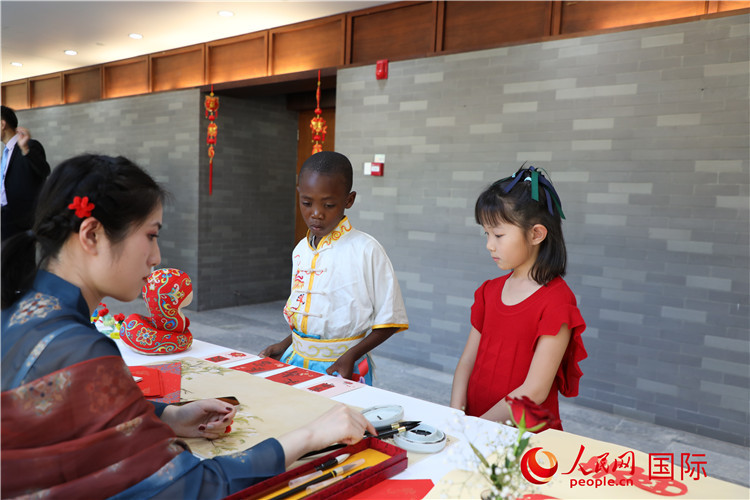 中國(guó)書法、剪紙等文化體驗(yàn)活動(dòng)吸引小朋友駐足欣賞。人民網(wǎng)記者 戴楷然攝