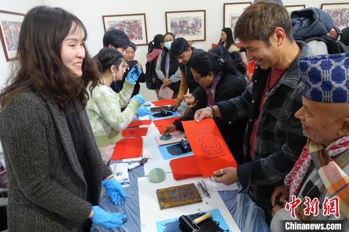 展覽現(xiàn)場還設(shè)置體驗(yàn)互動(dòng)區(qū),不少尼泊爾民眾體驗(yàn)了木版年畫制作。