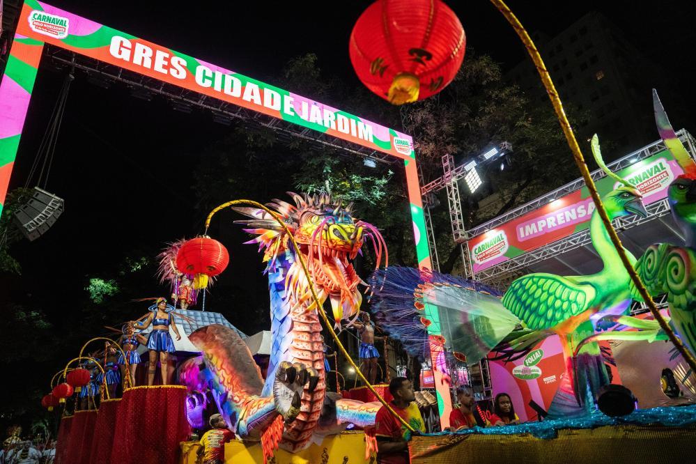 這是2024年2月14日凌晨在巴西貝洛奧里藏特拍攝的“城市花園”舞校的花車。表演主題為“穿越智慧之路 孔雀遇見龍——巴西-中國文化之旅”,慶祝巴中建交50周年并致敬中國龍年。新華社記者 王天聰 攝