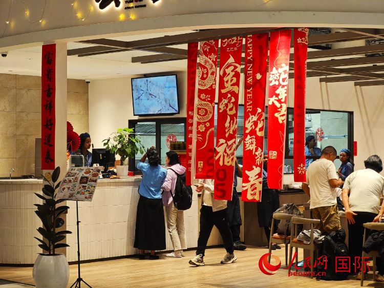 在機場的一家中餐廳,掛上了中文蛇年祝福語和春聯(lián)。人民網(wǎng)記者 黃煒鑫攝