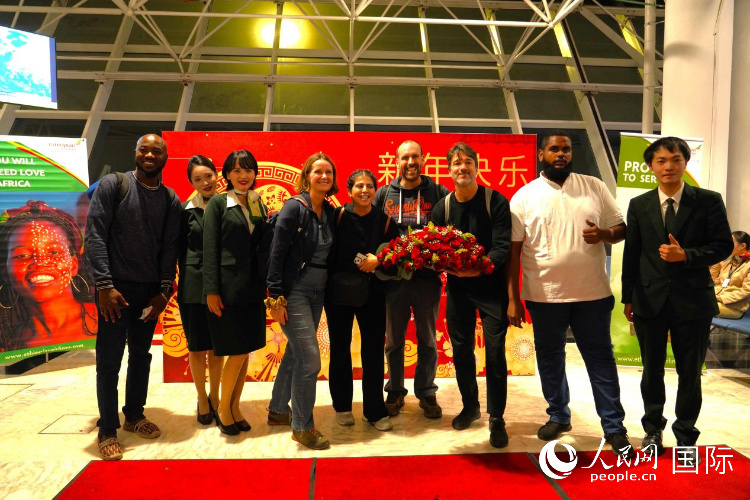 在埃塞航空春節(jié)慶?;顒蝇F(xiàn)場,旅客們與埃塞航空中國籍員工合影留念。人民網(wǎng)記者 黃煒鑫攝