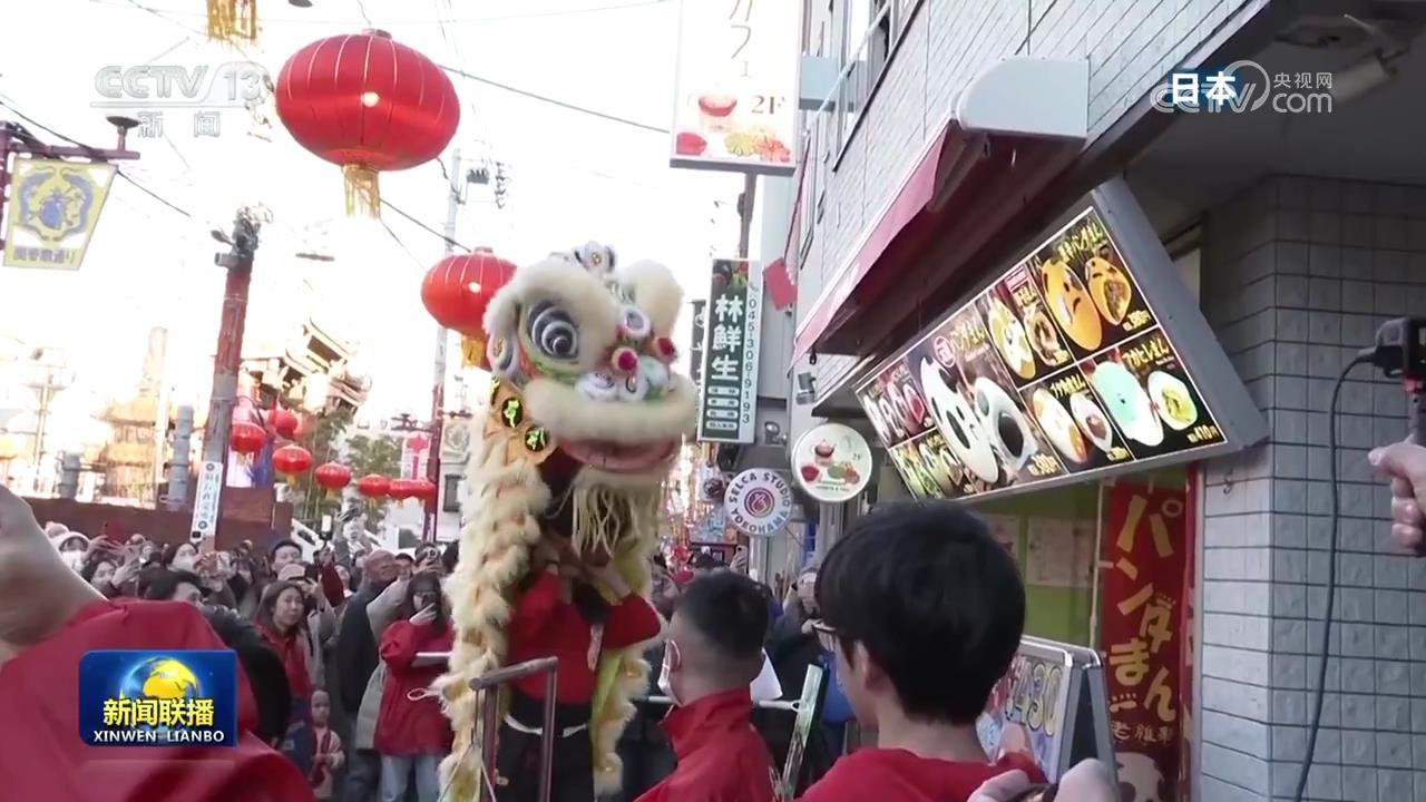 在日本橫濱的中華街,當?shù)貞c祝春節(jié)的傳統(tǒng)儀式舞獅采青吸引了大量民眾觀看。
