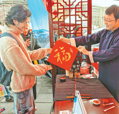 活動(dòng)現(xiàn)場(chǎng)的非遺手工藝品和美食區(qū)也吸引了大量當(dāng)?shù)孛癖妳⑴c,傳統(tǒng)手工藝糖畫(huà)、毛筆書(shū)法體驗(yàn)展位前更是排起了長(zhǎng)龍。當(dāng)?shù)孛癖娨翣柕掀澟抨?duì)很久終于如愿領(lǐng)取禮品,他饒有興致地觀看現(xiàn)場(chǎng)工作人員寫(xiě)下金色的“?!弊郑€特別要求加上他姓氏的中文譯名。“這是我第一次逛春節(jié)廟會(huì),這里熱鬧紅火,還有美食和禮品,向所有人開(kāi)放,非常新奇,富有創(chuàng)意。如果有機(jī)會(huì),我希望親自去中國(guó)走走看看!”伊爾迪茲說(shuō)。