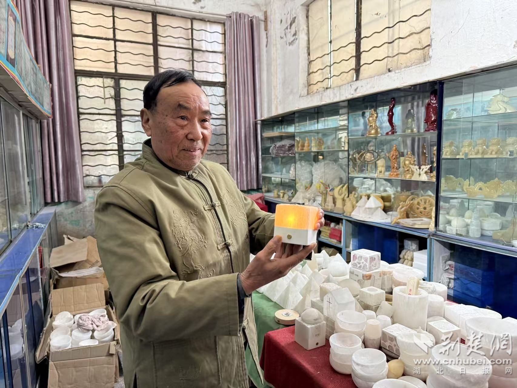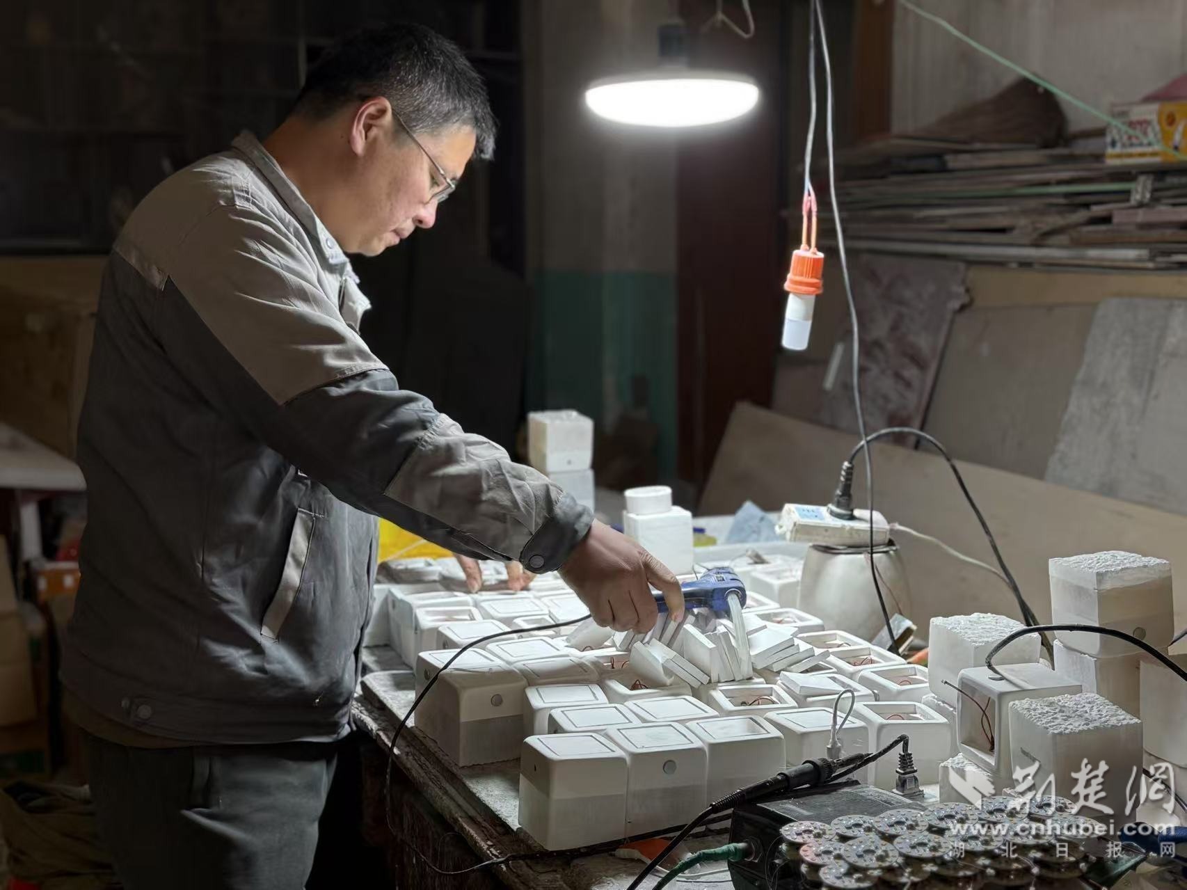 上世紀(jì)90年代,由于改革開放政策,應(yīng)城石膏銷路驟然寬廣,相關(guān)工藝產(chǎn)業(yè)迅速發(fā)展起來。應(yīng)城市工藝膏雕廠成立,伍佰林被任命為廠長(zhǎng)?!白铋_始是做石膏枕頭,市場(chǎng)需求很大,后來慢慢做文房四寶、工藝擺件、浮雕壁畫這些類型?!蔽榘亓纸榻B,隨著科技進(jìn)步和市場(chǎng)需求變化,膏雕工藝品也在不斷創(chuàng)新,融入一些聲光電技術(shù),比如石膏香氛、石膏臺(tái)燈等等產(chǎn)品,受到很多年輕人的喜愛。