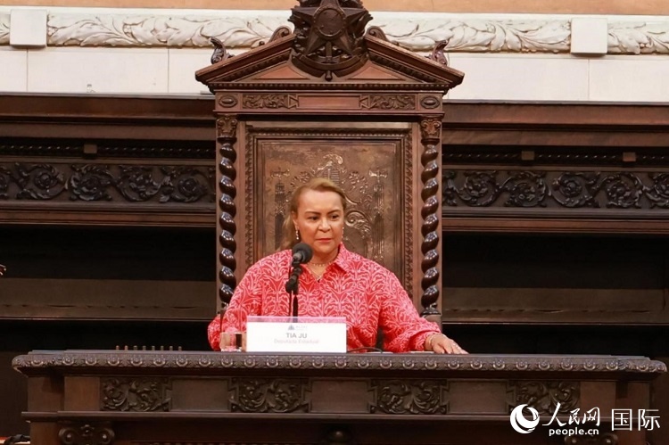里約州議會副議長、巴中議員陣線主席蒂婭·茹在活動中致辭。人民網(wǎng)記者 陳海琪攝