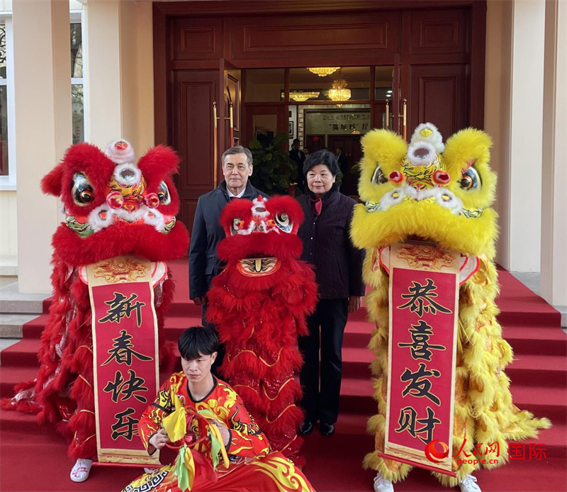上海合作組織秘書長(zhǎng)葉爾梅克巴耶夫(左)與上海合作組織睦鄰友好合作委員會(huì)副主席崔麗同舞獅合影。人民網(wǎng)記者 陳熙芮攝