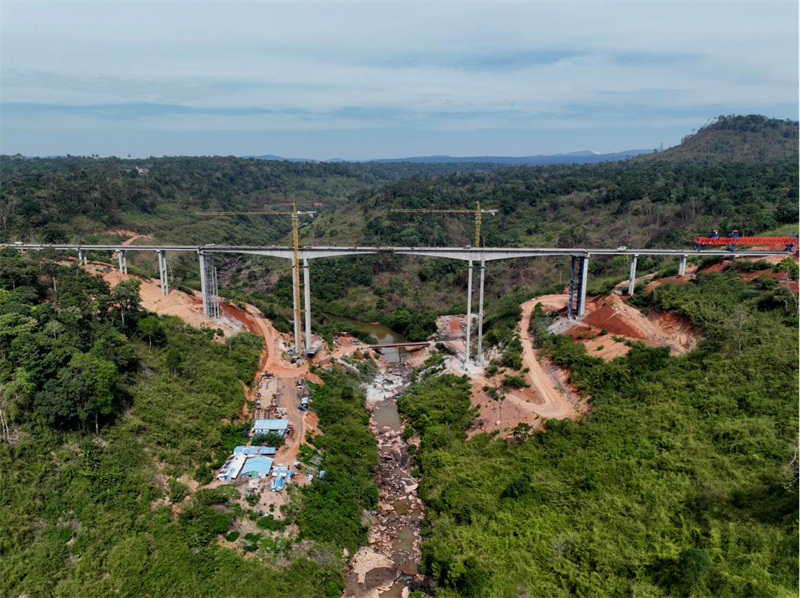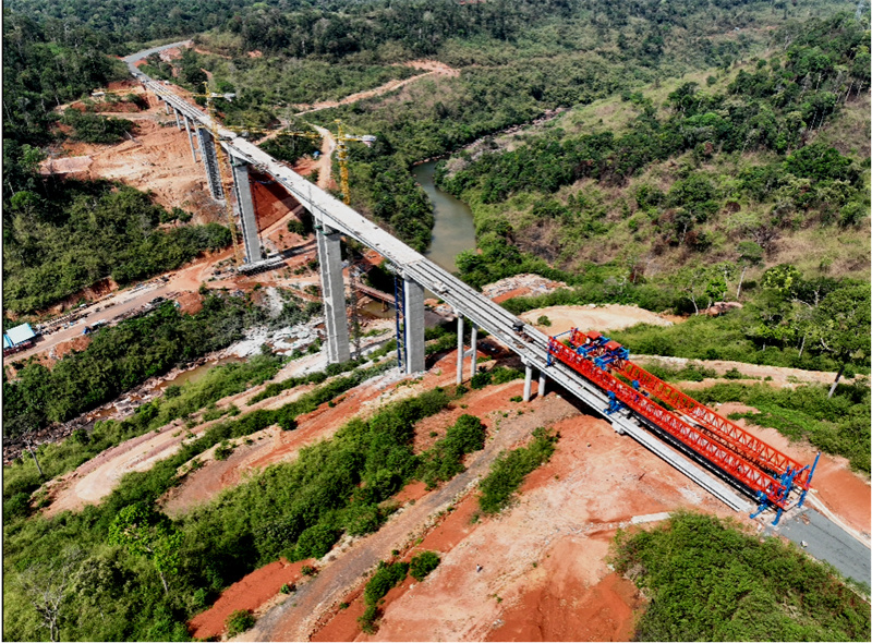 28號大橋全長530米,高80米,橫跨額勒賽河山谷,建成后將成為柬埔寨最高墩橋梁和首座跨山脊高架橋。大橋毗鄰國家級自然保護區(qū)和一級水源保護地,施工難度大,安全風險高。項目團隊克服了深基坑開挖、臨河施工等難題,研發(fā)了掛籃自動行走、無線測溫監(jiān)控等10余項新技術,提升了施工安全性和工程質量。
