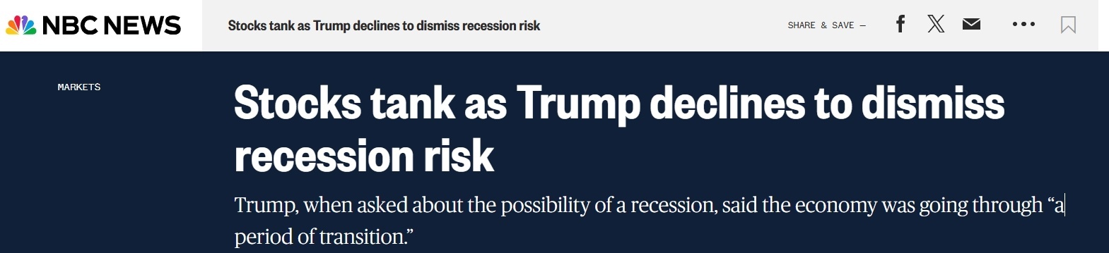根據(jù)美國全國廣播公司的分析,特朗普有關美國經(jīng)濟正在經(jīng)歷“過渡期”的言論,加之“不排除經(jīng)濟衰退的可能性”的觀點,都助推了市場的恐慌情緒。