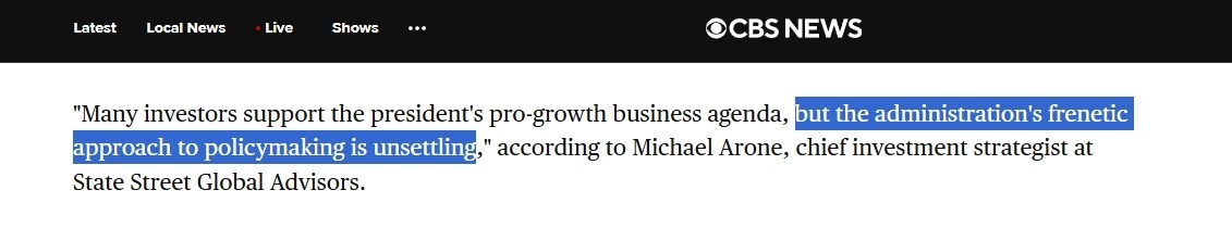 道富環(huán)球投資管理公司首席投資策略師邁克爾·阿羅內(nèi)更是直言,特朗普政府制定經(jīng)濟政策的方式是“瘋狂的”,“令人不安”。