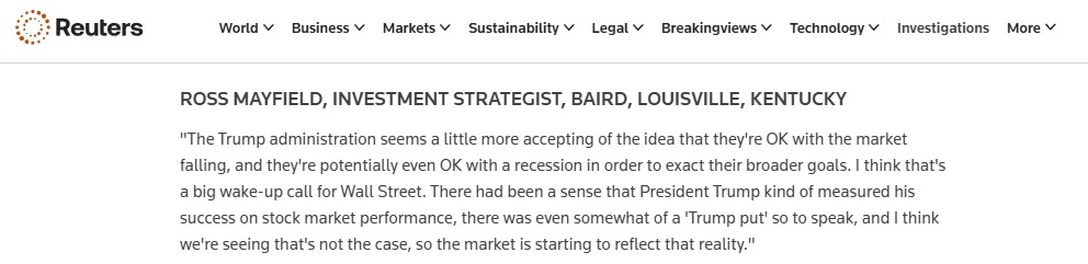 投資分析師羅斯·梅菲爾德表示,特朗普9日的言論似乎表現(xiàn)出其針對當前股市下行的趨勢是可以接受的。為了實現(xiàn)某些特定的執(zhí)政目標,特朗普政府甚至可能對“經(jīng)濟衰退”感到滿意,此前華爾街一貫認為特朗普政府在股市上需要獲得成功,而這樣的變化為華爾街的投資者敲響了警鐘。