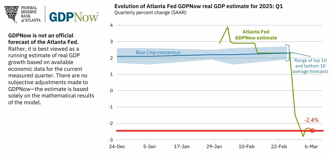 △3月6日,美國亞特蘭大聯(lián)儲的GDPNow模型預測,美國2025年第一季度國內(nèi)生產(chǎn)總值將萎縮2.4%。