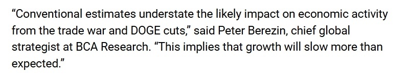 彼得·博瑞辛在10日公布的報告中表示,貿(mào)易戰(zhàn)和美國政府效率部的行動將造成的影響還未充分顯現(xiàn),經(jīng)濟增長極有可能還將進一步放緩。