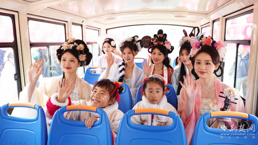 身著漢服的“桃花七仙女”乘坐花車(chē),緩緩駛?cè)敕奂t如綺霞、潔白似瑞雪、深紅若烈火的桃花林中。她們蓮步輕移,手持桃花團(tuán)扇,或輕嗅桃花,或倚樹(shù)而立,顧盼生姿,舉手投足盡顯古典韻味,與前來(lái)賞花的游客熱情互動(dòng)。