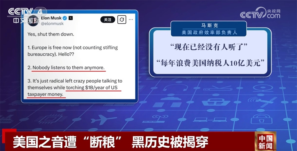 事實(shí)上,“美國(guó)之音”被噤聲早有跡象。2月9日,美國(guó)政府效率部負(fù)責(zé)人馬斯克在社交媒體平臺(tái)發(fā)文稱,美國(guó)之音電臺(tái)、自由歐洲電臺(tái)和自由廣播電臺(tái)等機(jī)構(gòu)“現(xiàn)在已經(jīng)沒人聽了”,它們“每年浪費(fèi)美國(guó)納稅人10億美元。”