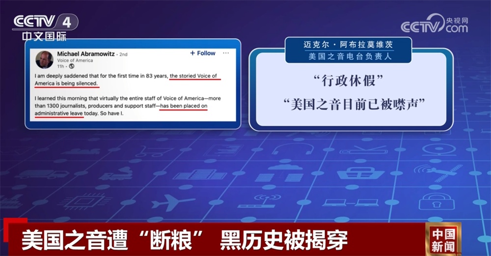 美國(guó)之音電臺(tái)負(fù)責(zé)人邁克爾·阿布拉莫維茨15日在社交媒體上說,他手下全部1300多名記者、制片人和助理幾乎都已被強(qiáng)制“行政休假”“美國(guó)之音目前已被噤聲” 。