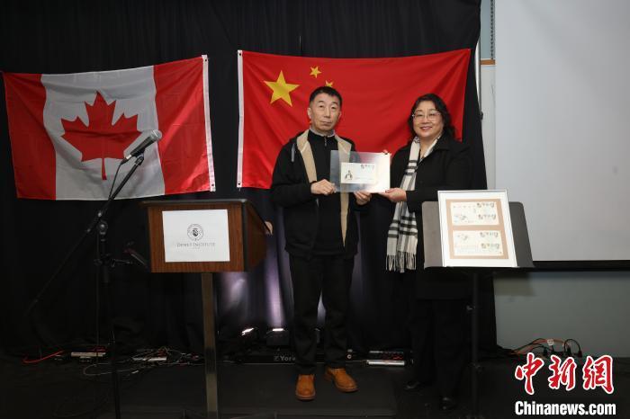 當(dāng)?shù)貢r間3月17日,位于白求恩家鄉(xiāng)加拿大安大略省穆斯科卡地區(qū)的杜威白求恩醫(yī)學(xué)護理學(xué)院和杜威公學(xué)舉行白求恩大夫誕辰135周年紀(jì)念活動。圖為著名畫家、郵票設(shè)計家劉向平(左)向校方捐贈由其設(shè)計、中加兩國聯(lián)合發(fā)行的白求恩誕生一百周年郵票的紀(jì)念封。中新網(wǎng)記者 余瑞冬 攝