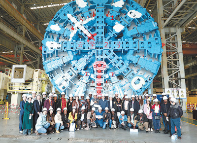 外媒記者來(lái)到位于江蘇常熟市的中交天和機(jī)械設(shè)備有限公司生產(chǎn)制造車(chē)間,與“云擎2號(hào)”盾構(gòu)機(jī)合影留念。環(huán)球網(wǎng)供圖