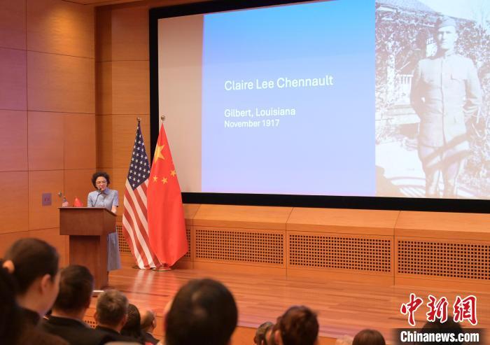 在發(fā)言的結(jié)尾,陳美麗摘讀了一段陳納德日記——“很多次我感到挫敗而準(zhǔn)備放棄,而每當(dāng)面臨抉擇之際,我選擇堅(jiān)守。我一生都在奮戰(zhàn),直至終點(diǎn)。我深知,我也會(huì)見(jiàn)證這場(chǎng)抗戰(zhàn)的終點(diǎn)”——她接著說(shuō),懷著同樣的堅(jiān)定決心,讓我們共同努力,克服障礙,共同促進(jìn)美中兩國(guó)的友誼與合作。